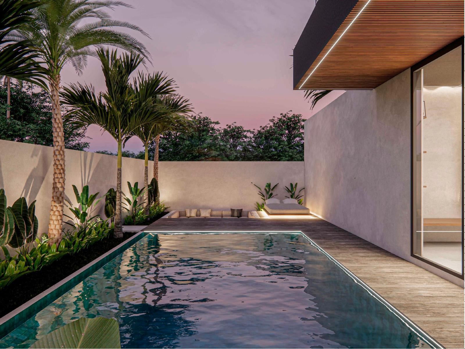 The outdoor area includes a private pool surrounded by tropical landscaping, creating an ideal space for relaxing or entertaining.